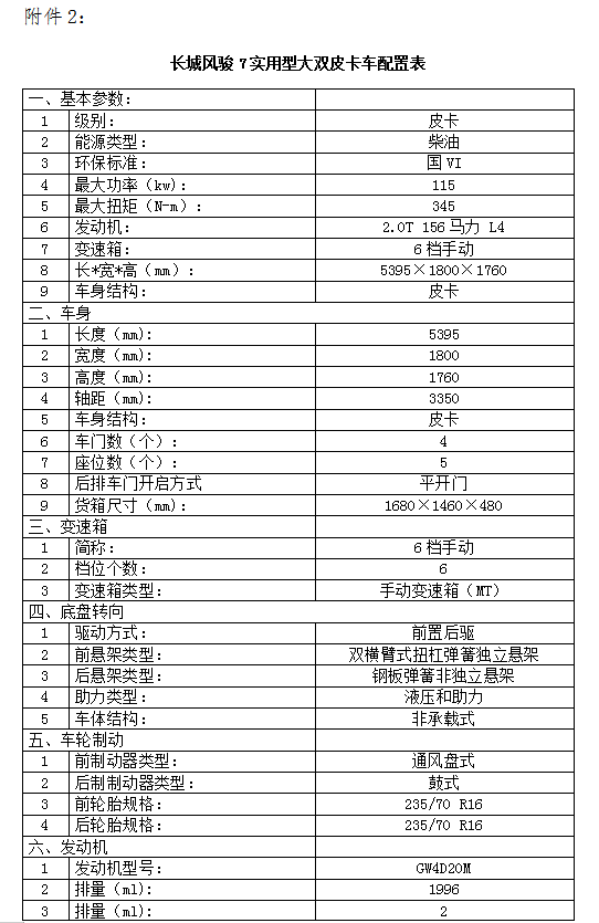 四、采購內(nèi)容及數(shù)量:皮卡車1輛(具體參數(shù)詳見附件2)