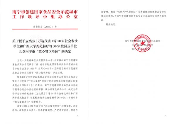 7月8日下午,2021年南寧市創(chuàng)建國家食品安全示范城市系列活動啟動儀式在南寧298上海天地購物中心舉行,我公司運營的秀苑餐廳、萃苑餐廳、東苑餐廳在此次活動中獲得“放心餐飲單位”榮譽稱號。